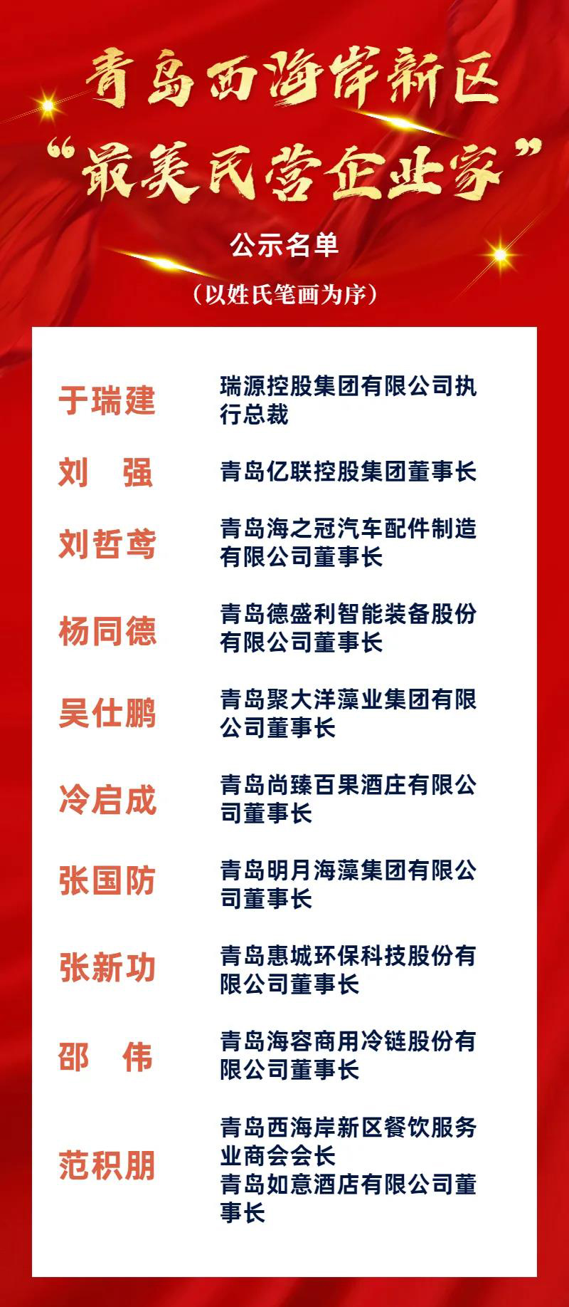 近日,工委区委统战部、工委区委宣传部、区工商业联合会(区民营经济发展局)联合开展青岛西海岸新区“最美民营企业家”评选活动。经过广泛宣传发动、优秀典型推荐、综合评价、联合评分等程序,评选出10名青岛西海岸新区“最美民营企业家”,青岛白金体育科技股份有限公司董事长、总经理张新功入选。